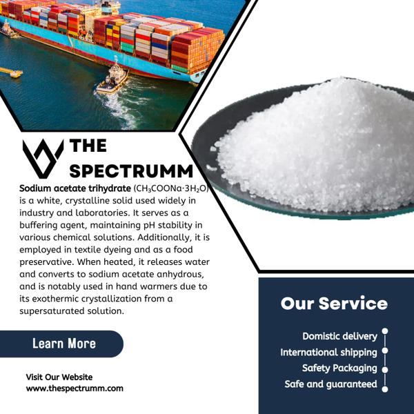 Sodium acetate trihydrate (CH₃COONa·3H₂O) is a white, crystalline solid used widely in industry and laboratories. It serves as a buffering agent, maintaining pH stability in various chemical solutions. Additionally, it is employed in textile dyeing and as a food preservative. When heated, it releases water and converts to sodium acetate anhydrous, and is notably used in hand warmers due to its exothermic crystallization from a supersaturated solution. #Import-Sodium-acetate-trihydrate-in-Germany #Best-Quality-Import-Sodium-acetate-trihydrate-in-Germany #REACH-registered-Import-Sodium-acetate-trihydrate-in-Germany #Best-Quality-REACH-registered-Import-Sodium-acetate-trihydrate-in-Germany #Import-Sodium-acetate-trihydrate-in-France #Best-Quality-Import-Sodium-acetate-trihydrate-in-France #REACH-registered-Import-Sodium-acetate-trihydrate-in-France #Best-Quality-REACH-registered-Import-Sodium-acetate-trihydrate-in-France #Import-Sodium-acetate-trihydrate-in-United-Kingdom #Best-Quality-Import-Sodium-acetate-trihydrate-in-United-Kingdom #REACH-registered-Import-Sodium-acetate-trihydrate-in-United-Kingdom #Best-Quality-REACH-registered-Import-Sodium-acetate-trihydrate-in-United-Kingdom #Import-Sodium-acetate-trihydrate-in-Italy #Best-Quality-Import-Sodium-acetate-trihydrate-in-Italy #REACH-registered-Import-Sodium-acetate-trihydrate-in-Italy #Best-Quality-REACH-registered-Import-Sodium-acetate-trihydrate-in-Italy #Import-Sodium-acetate-trihydrate-in-Spain #Best-Quality-Import-Sodium-acetate-trihydrate-in-Spain #REACH-registered-Import-Sodium-acetate-trihydrate-in-Spain #Best-Quality-REACH-registered-Import-Sodium-acetate-trihydrate-in-Spain #Import-Sodium-acetate-trihydrate-in-Netherlands #Best-Quality-Import-Sodium-acetate-trihydrate-in-Netherlands #REACH-registered-Import-Sodium-acetate-trihydrate-in-Netherlands #Best-Quality-REACH-registered-Import-Sodium-acetate-trihydrate-in-Netherlands #Import-Sodium-acetate-trihydrate-in-Belgium #Best-Quality-Import-Sodium-acetate-trihydrate-in-Belgium #REACH-registered-Import-Sodium-acetate-trihydrate-in-Belgium #Best-Quality-REACH-registered-Import-Sodium-acetate-trihydrate-in-Belgium #Import-Sodium-acetate-trihydrate-in-Poland #Best-Quality-Import-Sodium-acetate-trihydrate-in-Poland #REACH-registered-Import-Sodium-acetate-trihydrate-in-Poland #Best-Quality-REACH-registered-Import-Sodium-acetate-trihydrate-in-Poland #Import-Sodium-acetate-trihydrate-in-Austria #Best-Quality-Import-Sodium-acetate-trihydrate-in-Austria #REACH-registered-Import-Sodium-acetate-trihydrate-in-Austria #Best-Quality-REACH-registered-Import-Sodium-acetate-trihydrate-in-Austria #Import-Sodium-acetate-trihydrate-in-Sweden #Best-Quality-Import-Sodium-acetate-trihydrate-in-Sweden #REACH-registered-Import-Sodium-acetate-trihydrate-in-Sweden #Best-Quality-REACH-registered-Import-Sodium-acetate-trihydrate-in-Sweden
